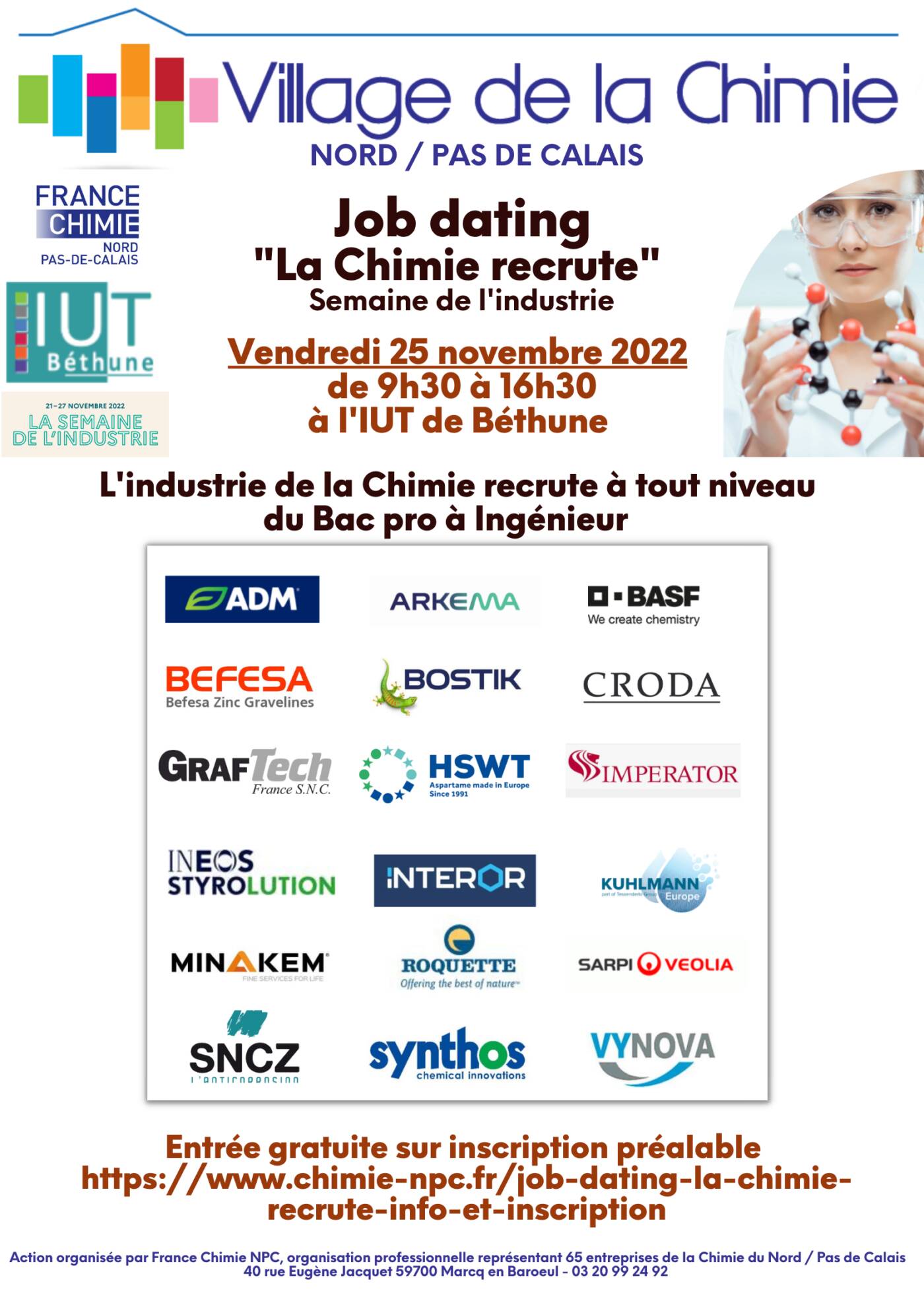 Un "Job dating / stage dating" des entreprises de la Chimie est organisé à l'occasion du Village de la Chimie Nord / Pas de Calais Vendredi 25 novembre 2022 dans les locaux de l'IUT de Béthune 9h30 16h30