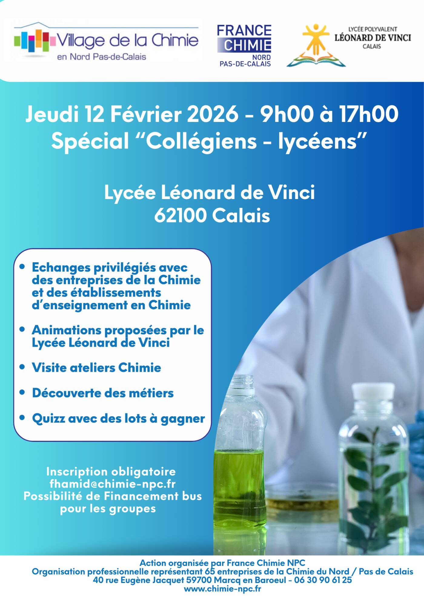 La 12ème édition du village de la Chimie en Nord / Pas de Calais se tiendra le jeudi 12 février 2026 de 9h à 17h en partenariat avec le Lycée Léonard de Vinci à Calais (uniquement sur insciption).